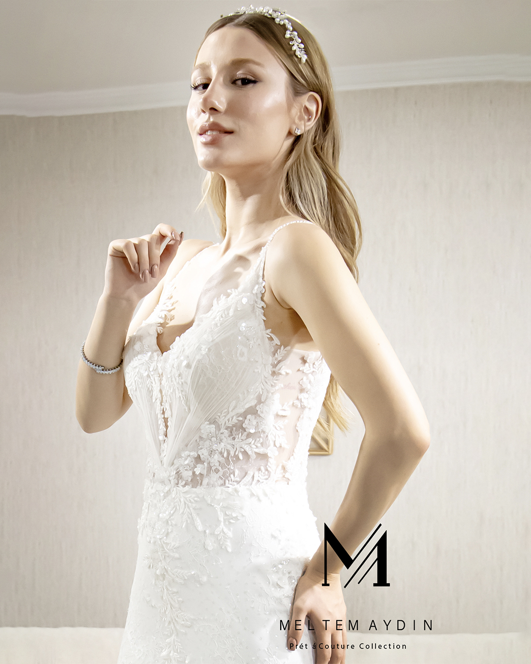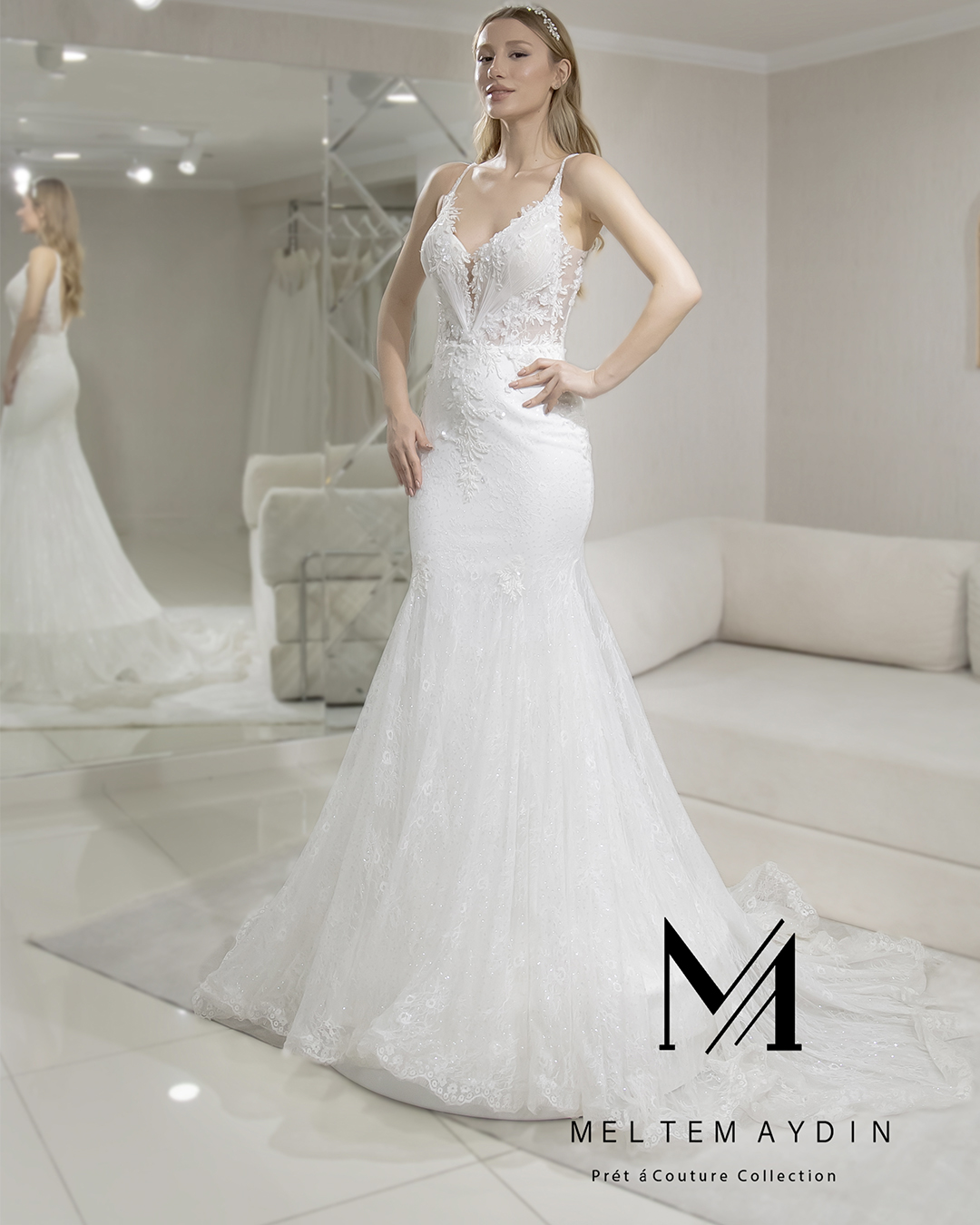 Bu gelinlik, bedeni zarifçe saran balık form kesimiyle tasarlanmıştır. İnce dantel işlemeli askılara ve derin V yaka detayına sahiptir. Sırt kısmı transparan dantel ve derin V kesimiyle dikkat çeker. Yüksek kaliteli Fransız dantel ve yumuşak tül katmanları kullanılarak üretilmiştir. İç kısmı hafif ve nefes alabilen astar ile kaplanmıştır. El işçiliği dantel aplikelerle süslenen model, gizli fermuar kapama sistemine sahiptir. Klasik beyaz tonunda olup, hafif yapısıyla rahat hareket imkânı sunar.